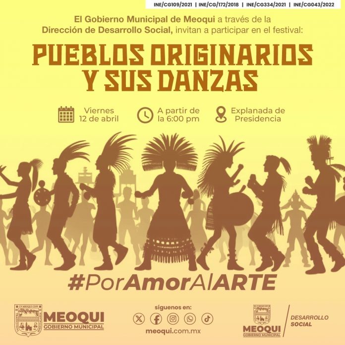 Meoqui.- El Gobierno de Meoqui invita a las familias del municipio y la región al Festival: Pueblos Originarios y sus Danzas, el cual se estará realizando en la explanada principal frente a la Presidencia Municipal este viernes 12 de abril, en punto de las 6 de la tarde.