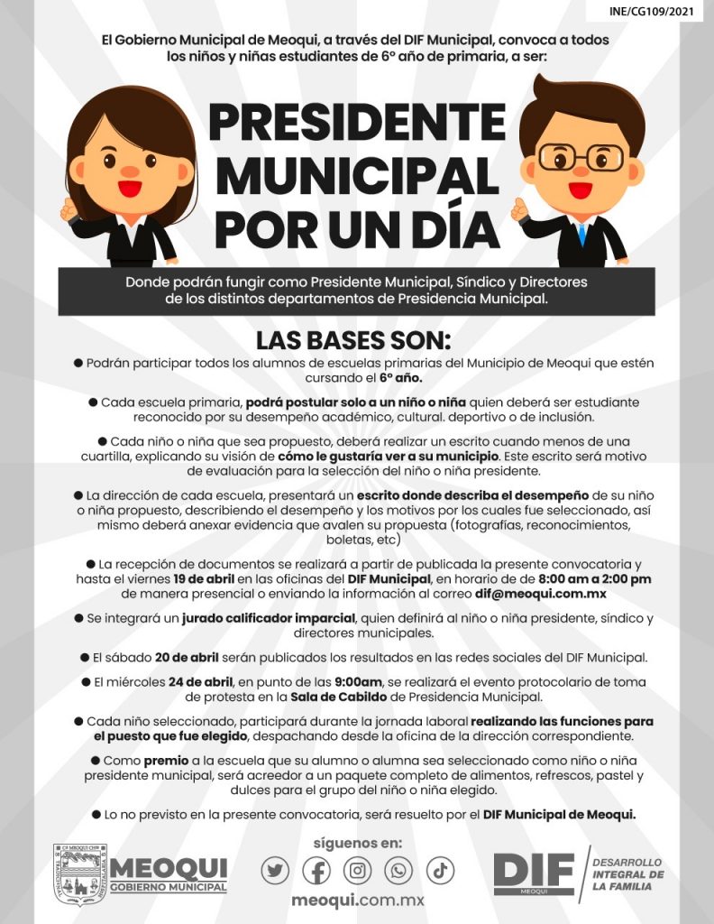 Seguido de la toma de protesta del “Niño o Niña Presidente por un Día” el día miércoles 24 a las 9 de la mañana en las instalaciones del DIF Municipal, convocatoria la cual sigue abierta, haciendo la invitación a todas las primarias del municipio a postular a alumnos destacados en las ramas académica, deportiva o cultural.