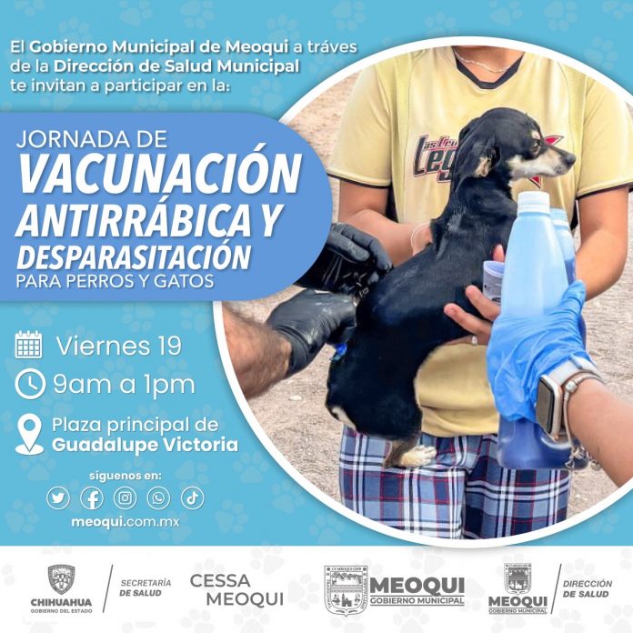Meoqui.- Continuando con la Campaña de Prevención de Enfermedades Transmitidas por Vectores, la Dirección de Salud del Gobierno Municipal de Meoqui informa que este viernes 19 de abril, de 9 de la mañana a 1 de la tarde, se llevará a cabo una vacunación antirrábica y desparasitación de mascotas en la Plaza Principal frente a la Presidencia Seccional, invitando a toda la población de la comunidad y sus alrededores.