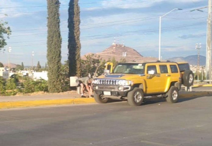 El presunto ladrón viajaba a bordo de una camioneta de lujo Hummer H3, de color amarillo y al momento de tomar la foto, la unidad se puede ver con la puerta trasera abierta donde subía los arbolitos.