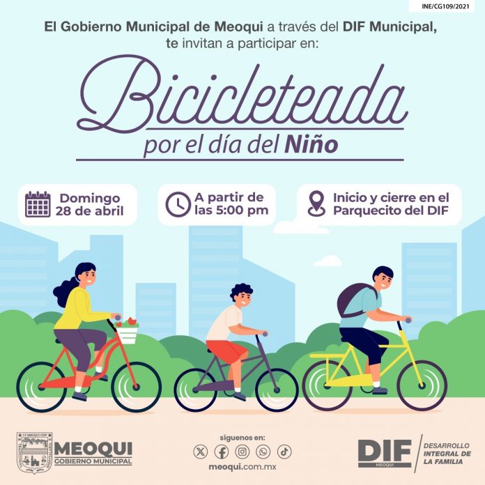 Meoqui.- El Gobierno de Meoqui a través del DIF Municipal, estará realizando una bicicleteada, la cual se llevará a cabo afuera de las instalaciones del parque del DIF, este próximo domingo 28 de abril a partir de las 5 de la tarde.