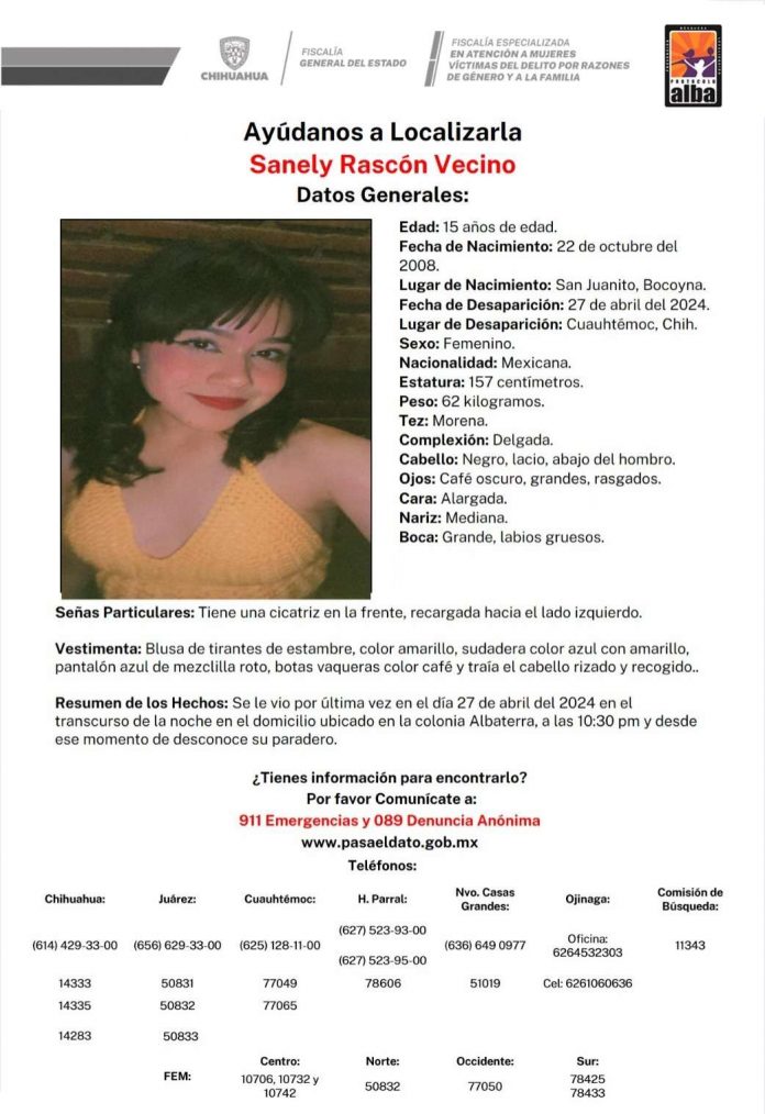 Cuauhtémoc.- Las autoridades solicitaron el apoyo de la comunidad para localizar a Sanely Rascón Vecino de 15 años de edad desaparecida en el municipio de Cuauhtémoc el pasado 27 de abril, vista por última vez en durante la noche en la colonia Albaterra.