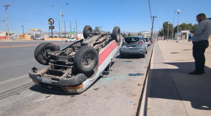 Chihuahua.- Esta tarde, choque y volcadura se registraron en la avenida Pacheco, justo al frente de la Comandancia Sur, luego de que el conductor de una pick up Ford, perdiera el control de su vehículo.