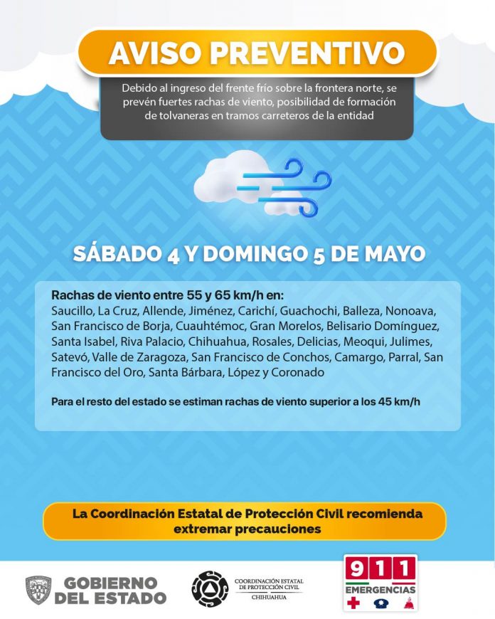 Chihuahua.- La Coordinación Estatal de Protección Civil (CEPC) dio a conocer que durante este fin de semana, se prevé la presencia ráfagas de viento que pueden superar los 55 y 65 kilómetros por hora (km/h).