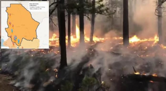 El incendio en Temósachic, en el Ejido Tutuaca, Ejido Conohachi, anexos y el Ejido El Riito, controlado al 70% y liquidado 60%, en una área de 1,085 hectáreas. Ahí laboran 227 combatientes.