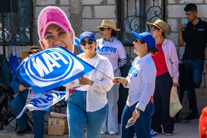 Al ritmo de la música, las banderas, el sonido de los claxons y un gran ambiente, la ciudadanía mostró su apoyo a la Arq. Miriam Soto, candidata a la Presidencia Municipal de Meoqui en el crucero realizado en las Calles Degollado y Doblado con la pega de calcas y micro perforados.