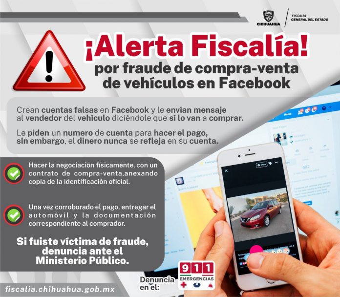 Delicias.- La Unidad de Investigación de Delitos Patrimoniales de la Fiscalía de Distrito Zona Centro en el municipio de Delicias, hace un llamado a la ciudadanía para evitar fraudes en trato de compra – venta de vehículos a través de redes sociales.