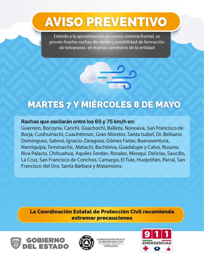 Las rachas podrían alcanzar los 75 kilómetros por hora (km/h) en Guerrero, Bocoyna, Carichí, Guachochi, Balleza, Nonoava, San Francisco de Borja, Cusihuiriachi, Cuauhtémoc, Gran Morelos, Santa Isabel, Dr. Belisario Domínguez, Satevó, Ignacio Zaragoza, Gómez Farías, Buenaventura, Namiquipa y Temósachic.