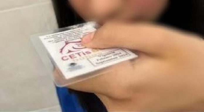 En las fotos se ven las alumnas con una credencial de la institución y una sustancia de dudosa procedencia y de color blanquecino en esta.