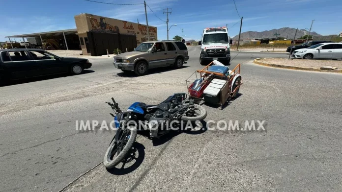 Camargo.- Un Corola color gris de modelo reciente iba de este a oeste por la Ginther sin hacer señalamiento de alto y se pasa una moto Italika color azul con un triciclo como remolque con productos de comida y lonches con destino a los campos agrícolas.