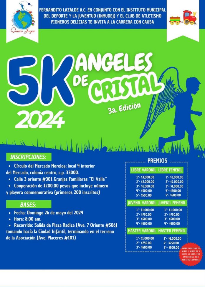 Delicias.- A través de conferencia de prensa, se dio a conocer la próxima carrera pedestre denominada “5k ángeles de cristal”, la cual es organizada por la asociación civil, Fernandito Lazalde, quiero jugar ac, siendo esta su tercera edición y se llevara a cabo este próximo 26 de nayo a las 8 de la mañana.