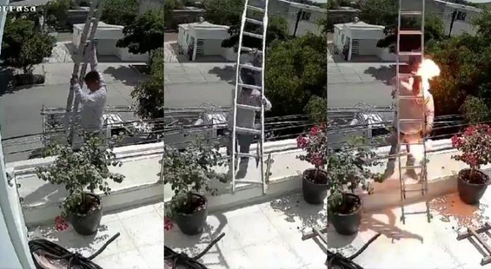 El video fue captado por una cámara de seguridad de una casa en Los Mochis, en donde un joven trabajador acudió a dar mantenimiento a la azotea, la cuál cuenta con alambre electrificado.