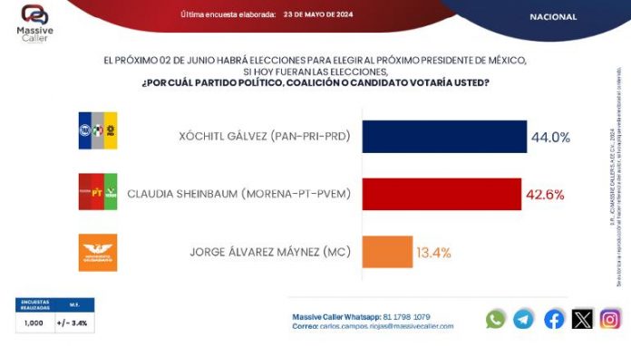 La encuestadora Massive Caller publicó nuevo sondeo, levantado ayer 23 de mayo, donde aparece Xóchitl Gálvez con el 44% de las preferencias para la Presidencia de México, seguida de Claudia Sheinbaum con 42.6%.