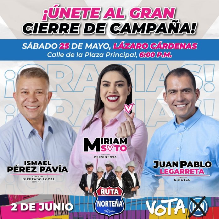Miriam Soto, candidata por el PAN, PRI y PRD a la alcaldía de Meoqui, Juan Pablo Legarreta a Síndico e Ismael Pérez Pavía, realizarán su cierre de campaña en el seccional de Lázaro Cárdenas este sábado 25 de mayo a partir de las 6:00 de la tarde en la a un costado de la Plaza Principal, donde los candidatos compartirán su mensaje y propuestas con las familias cardenenses, así como pasar una tarde de convivencia al ritmo del grupo Ruta Norteña de Tony Rentería.