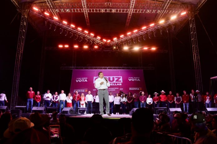 Ciudad Juárez, Chih.- En un ambiente de fiesta y con la presencia de más de 25 mil personas, Cruz Pérez Cuéllar, candidato a la alcaldía por la coalición “Sigamos Haciendo Historia en Chihuahua”, celebró su cierre de campaña en el suroriente de la ciudad.