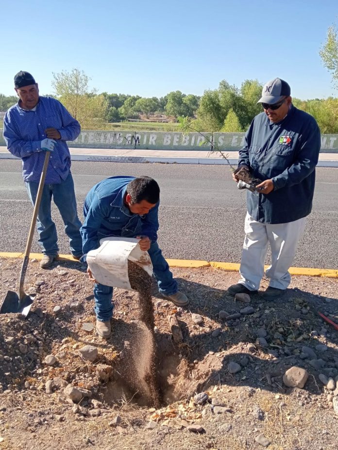 Realizan poda y reforestación en el Acceso Sur de Meoqui