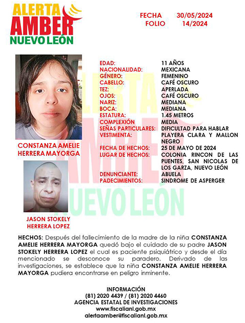 La menor se llama Constanza Amelie Herrera Mayorga y fue vista por última ocasión el 25 de mayo del 2024 en la colonia Rincón de las Puentes en San Nicolás de los Garza, Nuevo León.