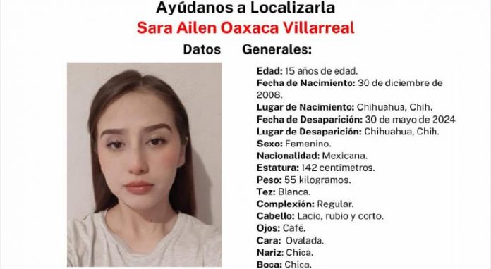 Chihuahua.- La Fiscalía solicita ayuda para encontrar a la jovencita Sara Ailen Oaxaca Villarreal de 15 años, quien desapareció el 30 de mayo del presente año en la capital. Por ahora se desconoce su paradero.