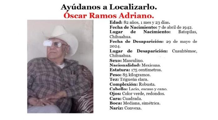 Chihuahua.- Medios de la ciudad de Cuauhtémoc, Chihuahua, reportaron la localización del ciudadano Óscar Ramos, de 82 años de edad, quien se encontraba desaparecido desde ayer. Lo ubicaron en un arroyo después de que perdió la orientación a causa de falla en su visión.