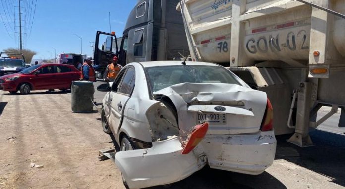 Chihuahua.- Esta tarde, un accidente vial se registró en el cruce del Lombardo Toledano y Sierra de la Silla, cuando el conductor de un Dodge Attitude perdió el control y terminó por estrellarse contra una base de concreto de la acera peatonal, para luego ser impactado por un tráiler que circulaba en el mismo sentido, el cual no alcanzó a frenar.