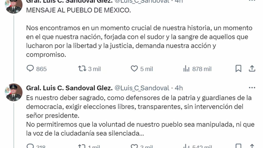 Después, los supuestos mensajes del general Sandoval piden que la ciudadanía actúe en defensa de la democracia y de la Constitución.
