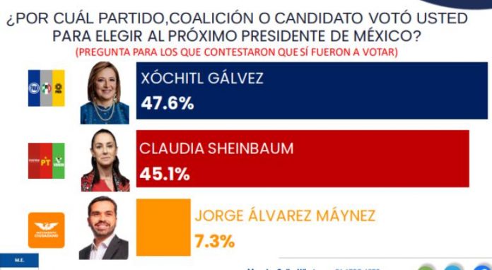 Esto quiere decir que Gálvez Ruiz supera por 1.5 puntos porcentuales a Sheinbaum Pardo, aunque el margen de error es del 3.4%, por lo que se declara “empate técnico”, siendo un sondeo.
