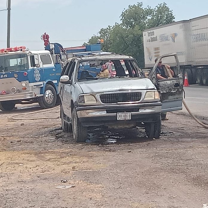 Delicias.- En un lamentable suceso, bomberos federales atendieron un incendio que consumió por completo un vehículo en la carretera federal de sur a norte, en el tramo Delicias a Meoqui, cerca del Yonke Almanza.