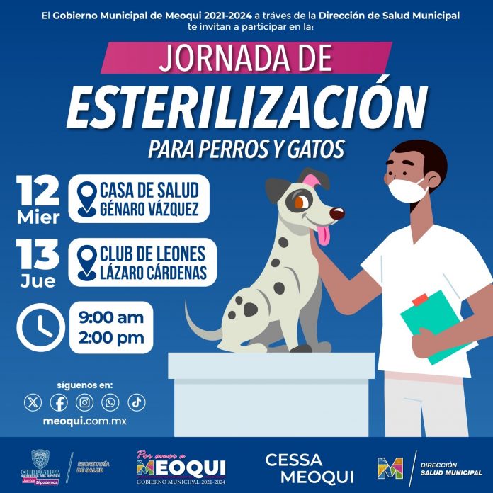 Meoqui.- Este miércoles 12 y jueves 13 de junio, se llevará a cabo una nueva jornada de esterilización totalmente gratuita en la Casa de Atención Primaria a la Salud de la Col. Genaro Vázquez y el Club de Leones del seccional de Lázaro Cárdenas, respectivamente, sin ningún costo para las familias, teniendo la capacidad de atender 30 mascotas por día, así lo informó la Dra. Sayuri Núñez, directora de Salud en el municipio.