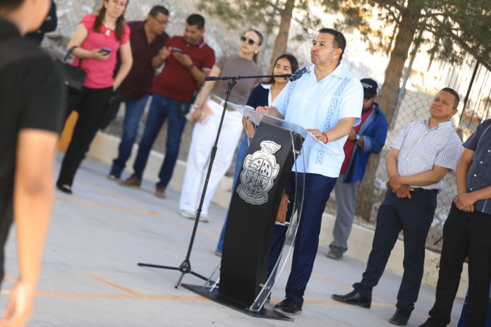 Ciudad Juárez.- El Presidente Municipal, Cruz Pérez Cuéllar, encabezó la entrega de los trabajos de rehabilitación en la Telesecundaria Tarahumara, ubicada en la calle Creel, de la colonia Tarahumara, en la zona poniente de la ciudad.