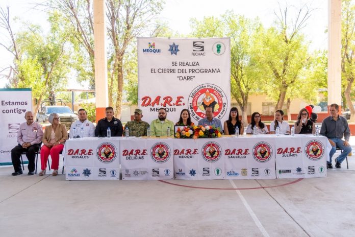 Meoqui.- Más de 2 mil estudiantes del municipio de Meoqui han sido beneficiados a través del programa D.A.R.E. durante los últimos dos años, donde se tiene el objetivo de prevenir las adicciones de sustancias legales e ilegales, además de los abusos y la violencia entre los más jóvenes, siendo este jueves la clausura de actividades en la Primaria 5 de Febrero de Estación Consuelo.