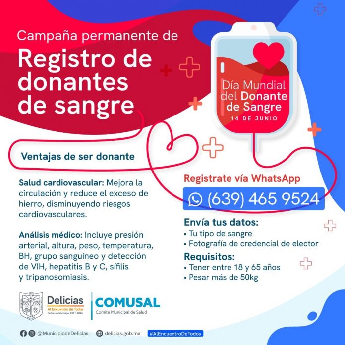Delicias.- En el marco del Día Mundial del Donante de Sangre, que se conmemora cada 14 de junio, el Gobierno Municipal de Delicias, a través de la Coordinación Municipal de Salud, invita a la ciudadanía a participar en la campaña permanente de registro de donantes de sangre.
