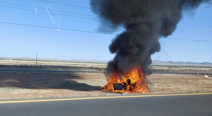 Chihuahua.- Durante la mañana de este sábado, un fuerte inciendio de un vehículo se registró en la carretera que conduce de Sueco a Villa Ahumada, el cual consumió por completo la unidad y generó una gran columna de humo negro en la zona, hasta el momento se desconoce su hubo personas lesionadas.