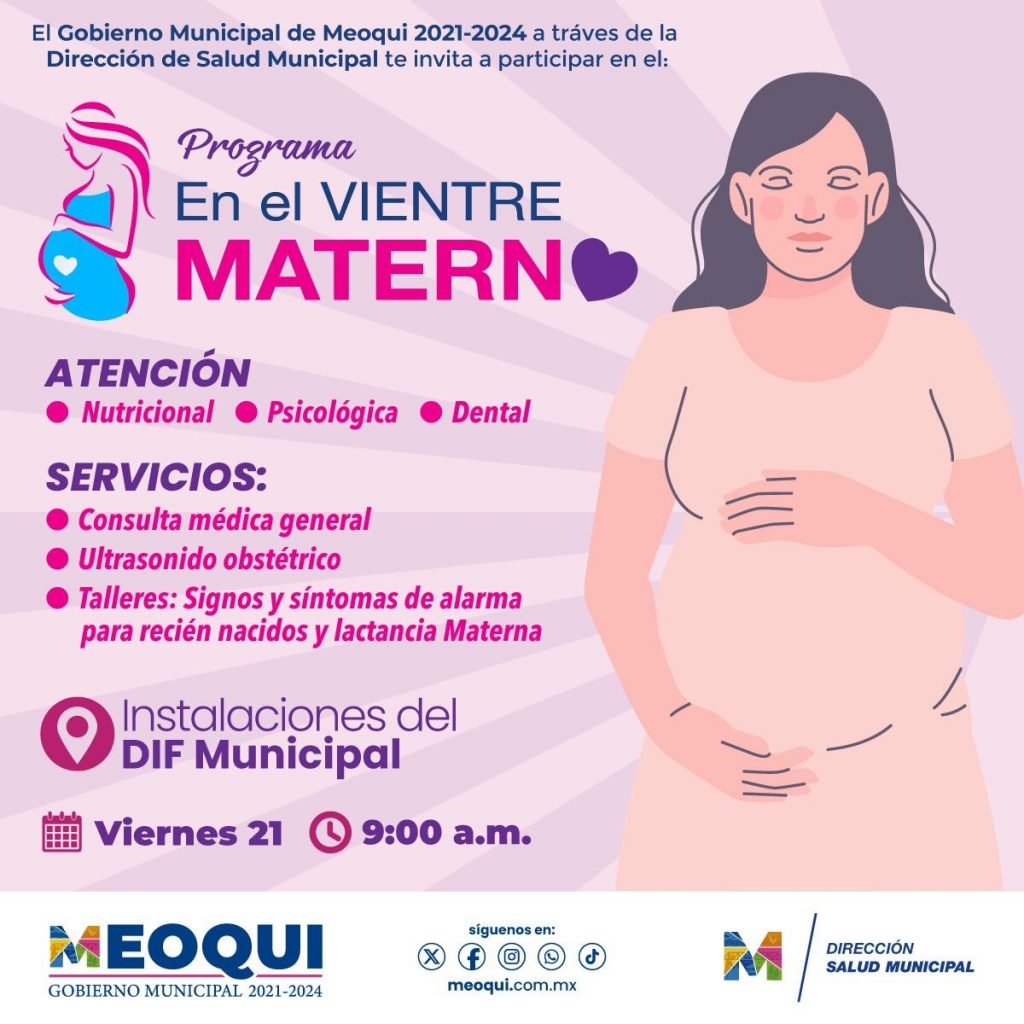 Meoqui.- Con atención médica, dental, nutricional y psicológica, ultra sonido obstétrico, talleres y detecciones totalmente gratuitas para las mujeres embarazadas de Meoqui, este viernes se realizará el programa “En el Vientre Materno”, dando inicio en punto de las 9 de la mañana, en las instalaciones del DIF Municipal.