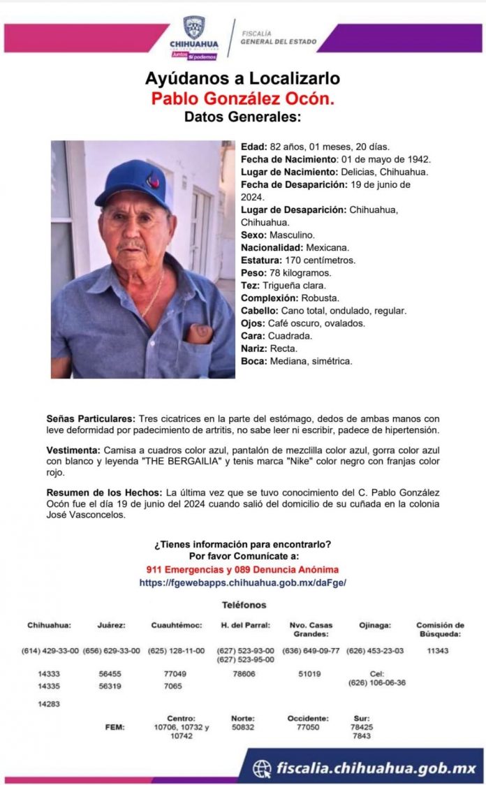 Delicias.- Pablo González Ocón, de 82 años de edad, está desaparecido desde el 19 de junio de 2024 en Chihuahua, Chihuahua. Según los datos proporcionados, el señor González Ocón fue visto por última vez saliendo del domicilio de su cuñada en la colonia José Vasconcelos.