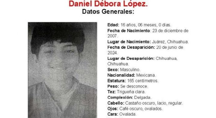 Chihuahua.- La Fiscalía General del Estado, publicó la pesquisa de Daniel Débora López, un menor de 16 años de edad que salió ayer del Centro de Asistencia Social “Unidas por Amor A.C.”, ubicado en la ciudad de Chihuahua.