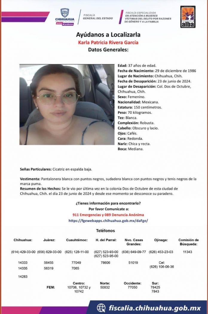 De acuerdo a la información proporcionada por la Fiscalía General del Estado, la joven responde al nombre de Karla Patricia Rivera García quien desapareció en la colonia antes mencionada y por lo que al momento se ha comenzado a difundir su pesquisa para poder localizarla.