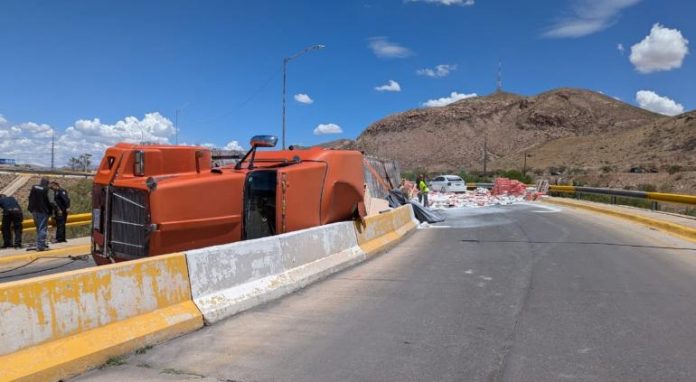 Chihuahua.- Esta mañana la volcadura de un tráiler que transportaba yeso tuvo lugar en la avenida 20 de noviembre justo en la curva para ingresar a Lombardo Toledano, el incidente no dejó lesionados, pero sí enormes daños materiales.