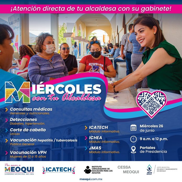 Meoqui.- Con servicios como corte de cabello gratuito, consulta médica general, detecciones de diabetes, dispensario médico, donación de árboles, vacunación de hepatitis, tuberculosis y VPH; este miércoles se llevará acabo el “Miércoles con tu Alcaldesa” en punto de las 9 de la mañana en los portales de la Presidencia Municipal, programa en el cual la alcaldesa Miriam Soto y todo su gabinete, estarán escuchando las peticiones de la ciudadanía para resolverlos de manera directa.