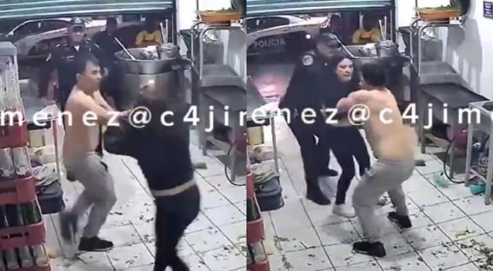 México.- Una mujer terminó apuñalando a su esposo luego de que tuvieran una fuerte discusión. Al parecer, el señor no le ayudó a barrer el negocio en el que trabajan, la policía estaba presente cuando esto ocurrió.