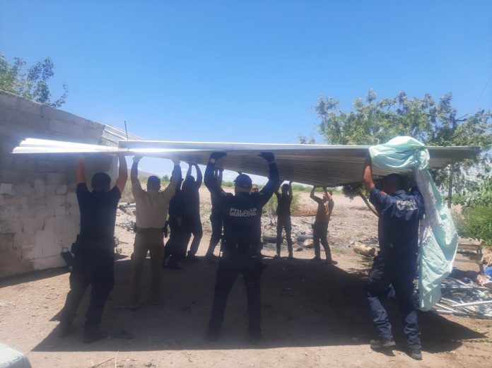 Rosales.- Los elementos de la Dirección de Seguridad Pública y Vialidad, así como de Protección Civil, continúan apoyando a los domicilios dañados por las intensas lluvias y fuertes vientos registrados el día de ayer en la comunidad de Ortiz y sus alrededores.