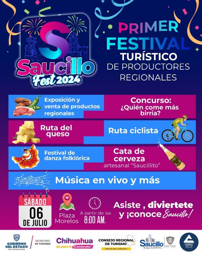 Saucillo.- La alcaldesa de Saucillo, Aidé López De Anda, extendió una cordial invitación a toda la ciudadanía para asistir al Saucillo Fest 2024, el primer Festival Turístico de Productores Regionales, que se llevará a cabo este sábado 6 de julio a partir de las 8:00 am en la Plaza Morelos.
