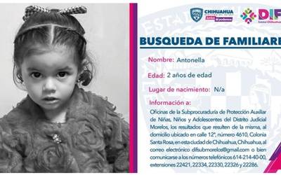 Chihuahua.- Como parte de las labores de búsqueda que ha iniciado el Desarrollo Integral de la Familia del Estado de Chihuahua (DIF), han difundido una pesquisa para localizar a la familia de una niña de dos años de edad, quien responde al nombre de Antonella y quien en el mes de diciembre de 2023 fue abandonada a su suerte.