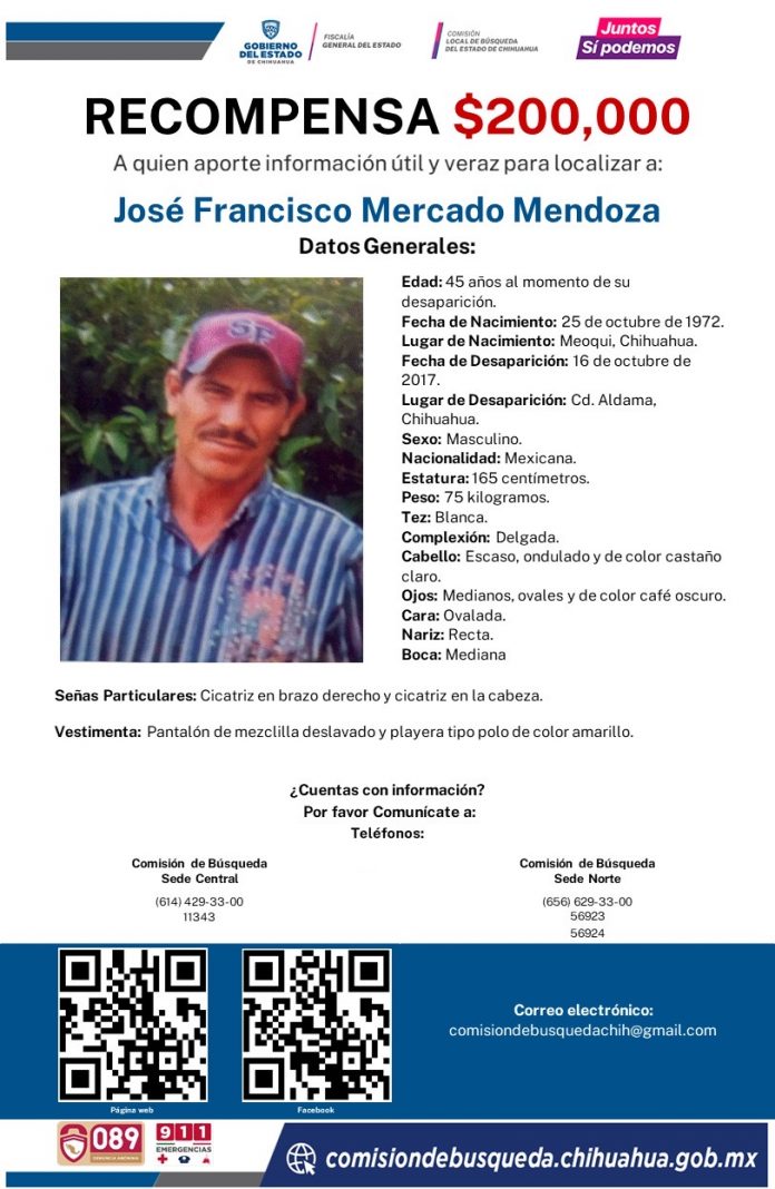 Chihuahua.- La familia de José Francisco Mercado Mendoza ha anunciado una recompensa de $200,000 pesos mexicanos a quien proporcione información útil y veraz que conduzca a la localización de este ciudadano, desaparecido desde el 16 de octubre de 2017.