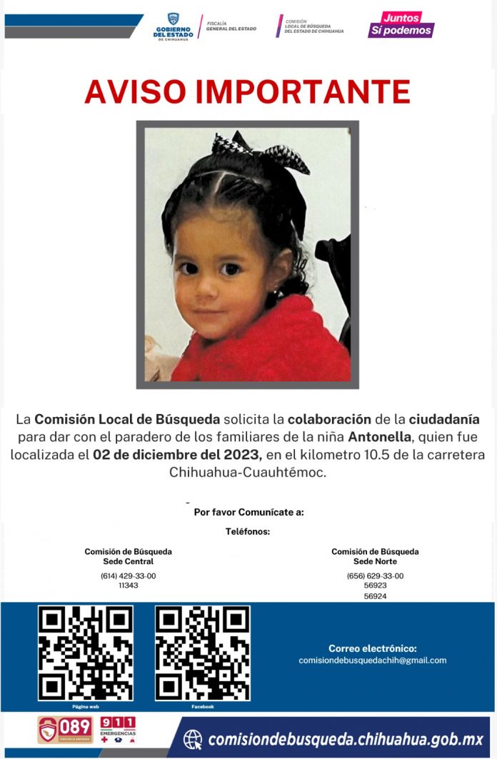 Chihuahua.- La Comisión Local de Búsqueda de Personas Desaparecidas ha emitido un llamado urgente a la comunidad para obtener información que conduzca al paradero de los familiares de una niña identificada como Antonella, cuyo hallazgo ocurrió el pasado 2 de diciembre en el kilómetro 10.5 de la carretera Chihuahua-Cuauhtémoc.