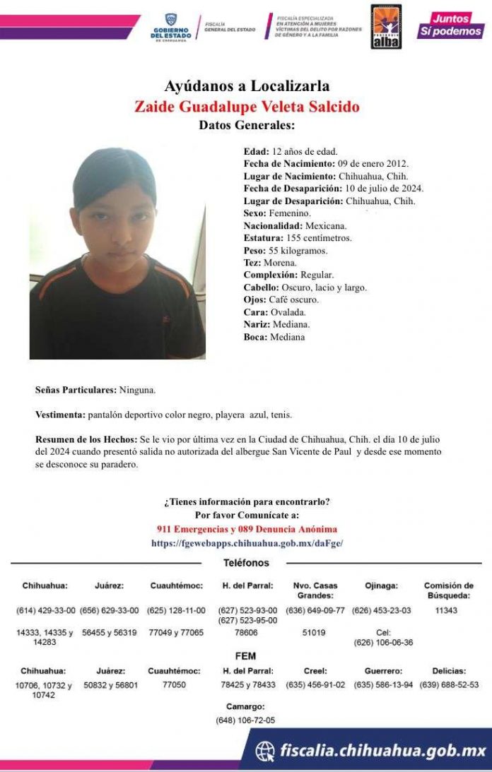 Chihuahua.- La fiscalía del estado solicita el apoyo de la ciudadanía para localizar a una niña de 12 años que se salió sin permiso del albergue donde se encontraba.