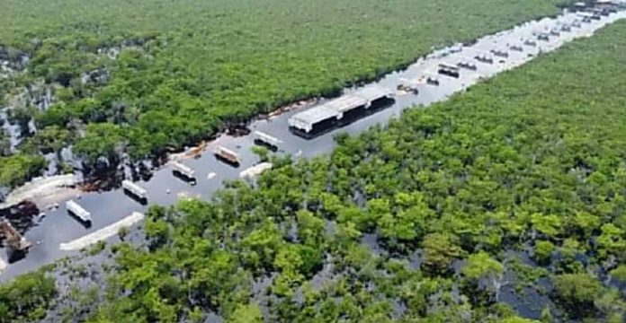 México.- En Bacalar, los escurrimientos de agua provocados por fuertes tormentas que han azotado la zona sur de Quintana Roo han afectado un amplio tramo de construcción de las vías del Tren Maya.