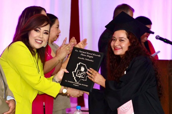 Saucillo.- La alcaldesa Aidé López De Anda asistió a la emotiva ceremonia de graduación de la generación 2020-2024 de la Escuela Normal Rural Ricardo Flores Magón, de la cual tuvo el honor de ser madrina. En esta ocasión, 98 alumnas culminaron su educación, celebrando un importante logro académico.