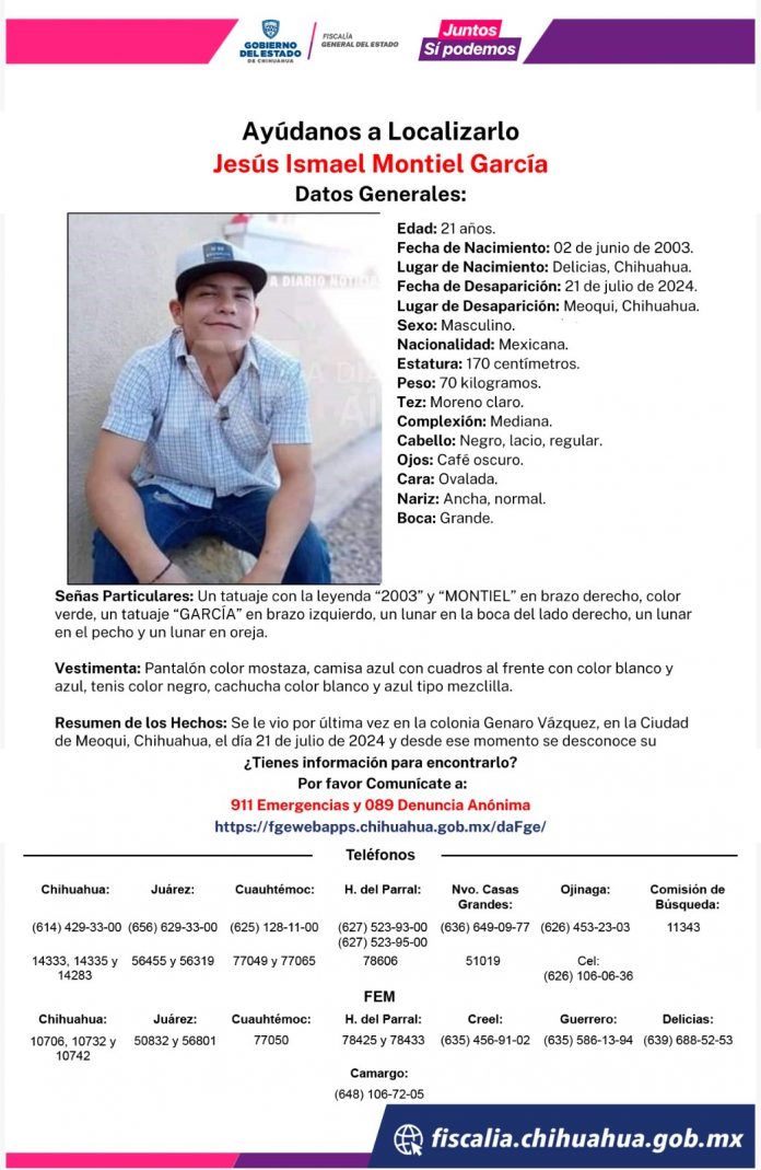 Meoqui,.- La familia de Jesús Ismael Montiel García, de 21 años de edad, hace un llamado desesperado a la población para ayudar a localizarlo, después de que desapareciera el pasado 21 de julio en la colonia Genaro Vázquez, en esta ciudad.