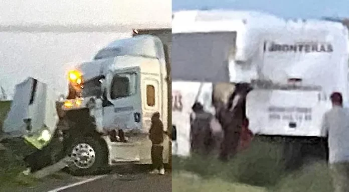 Camargo.- El incidente ocurrió alrededor de las 6:00 a.m., involucrando un camión de pasajeros de la Línea “Fronteras” y un tráiler de paquetería. Debido al fuerte impacto, el camión de pasajeros salió de la cinta asfáltica, quedando a un lado de la carretera.
