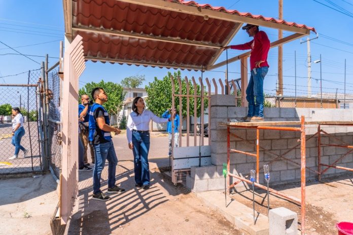 Meoqui.- La alcaldesa Miriam Soto realizó la supervisión del acceso principal de la Primaria Antón Makarenko, donde se participa en conjunto con la Sociedad de Padres de Familia y la institución educativa para construir dicha área, en la cual, el Gobierno Municipal participó con el diseño del lugar y el material.